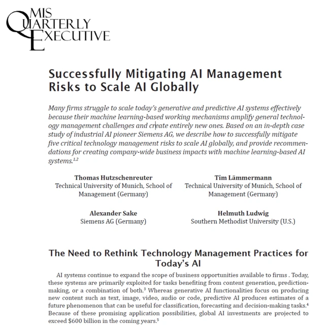 In their paper "Successfully Mitigating AI Management Risks to Scale AI Globally" Professor Hutzschenreuter et al. describe, based on an in-depth case study of industrial AI pioneer Siemens AG, how to successfully mitigate five critical technology management risks to scale AI globally, and provide recommendations for creating company-wide business impacts with machine learning-based AI systems.